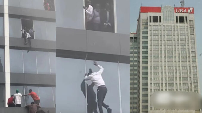Heart-pounding videos capturing the sheer terror of United Bank for Africa (UBA) employees hurling themselves from upper-floor windows to escape a ferocious fire have taken social media by storm, leaving Nigerians reeling and demanding answers on workplace safety. The clips, shared widely under captions like “This is not funny,” show desperate staff at the bank’s Broad Street branch in Lagos Island abandoning all caution as thick black smoke chokes the Afriland Towers, a six-storey commercial hub housing UBA alongside the Federal Inland Revenue Service (FIRS) and other firms.